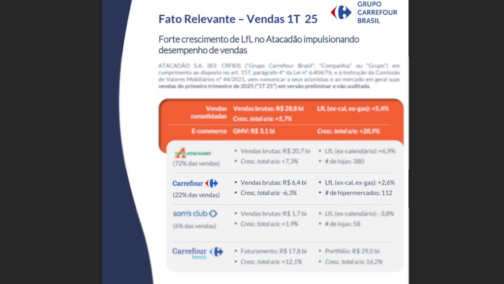 A rede varejista Carrefour é apenas uma das empresas do grupo com o mesmo nome no Brasil. No país, a companhia também controla um banco homônimo, além das redes Atacadão e Sam’s Club — todos os três fecharam o primeiro trimestre de 2025 com aumento no faturamento das vendas.