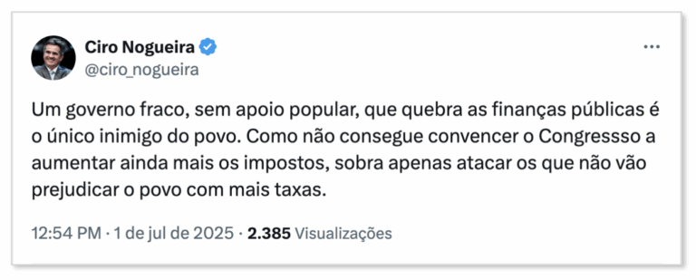 O senador e presidente do PP, Ciro Nogueira (PI), criticou nesta 3ª feira (1º.jul.2025) a reação do governo à derrubada…