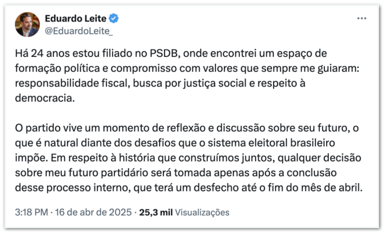 Eduardo Leite decidirá futuro partidário no final de abril