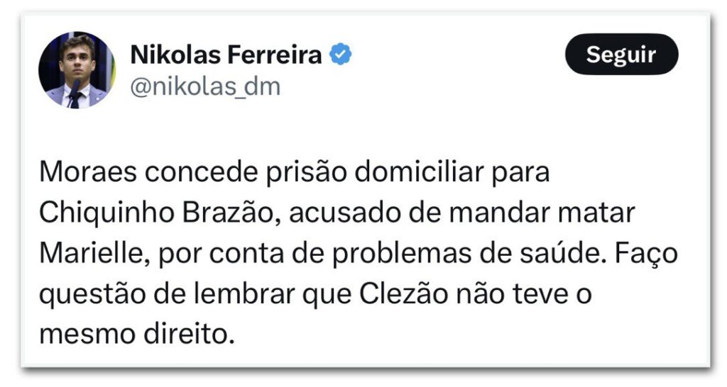 No X (ex-Twitter), o deputado Nikolas Ferreira (PL-MG) relembrou o preso do 8 de Janeiro que morreu no Complexo Penitenciário da Papuda em novembro de 2023, depois de sofrer um mal súbito durante o banho de sol. Outro integrante do PL, o vereador Lucas Pavanto (SP), também comentou a decisão e deu “parabéns” aos envolvidos.