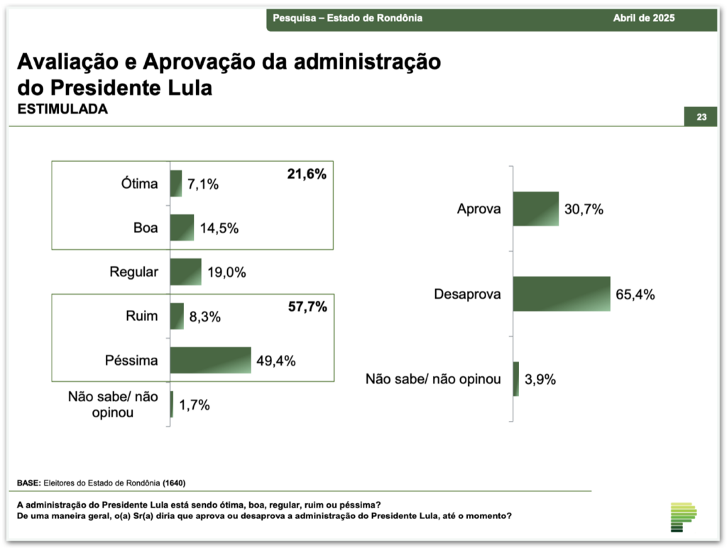 Levantamento divulgado nesta 5ª feira (17.abr.2025) pelo Paraná Pesquisas mostra que a desaprovação do governo do presidente Luiz Inácio Lula da Silva (PT) chega a 65,4% em Rondônia (RO). Outros 30,7% disseram aprovar a gestão do petista, enquanto 3,9% não responderam. Eis a íntegra (PDF – 574 kB).