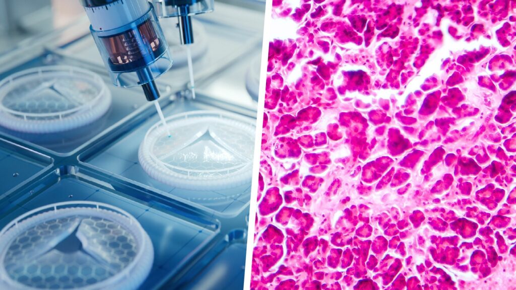 Pesquisa usa ilhotas pancreáticas humanas reais e biotinta inovadora para criar células que mantêm estrutura e resposta à glicose por 21 dias. Imagem de impressora médica avançada e micrografia óptica do pâncreas, que mostra ilhotas onde a insulina é produzida