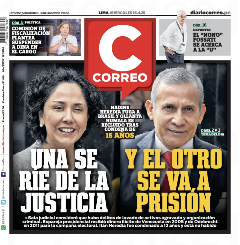 No Diario Correo, a manchete de 4ª feira (16.abr.2025) foi intitulada “Uma ri da Justiça e o outro vai para a prisão”: