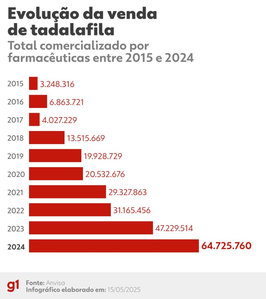 A venda de tadalafila é quase 20 vezes maior agora do que há dez anos no Brasil, segundo um levantamento exclusivo feito pelo g1. Para se ter uma ideia, de cada 1 comprimido que era vendido antes, hoje são vendidos 20. (Veja os números abaixo)